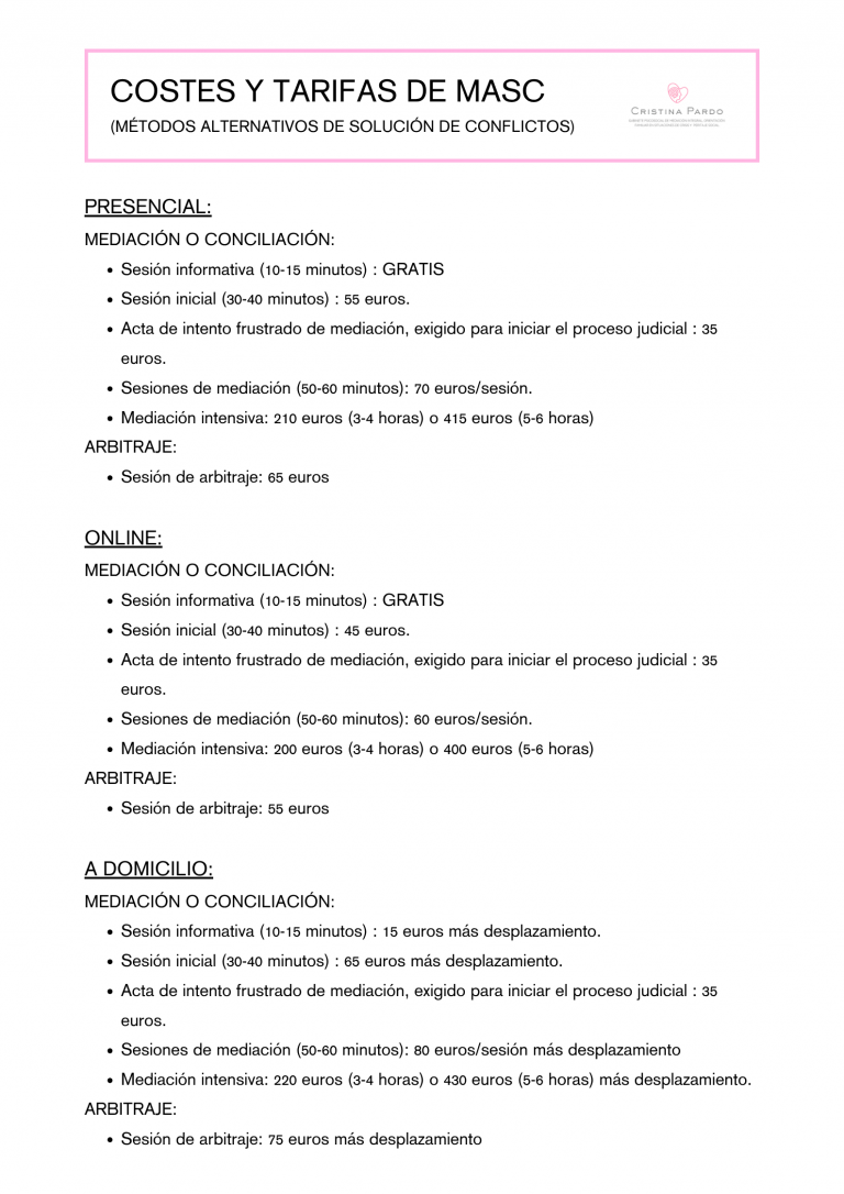 MEDIACIÓN INTENSIVA: 210€/INFORME BÁSICO (3-4 HORAS) Y 420€/INFORME COMPLEJO (5-6 HORAS) MÁS DESPLAZAMIENTO